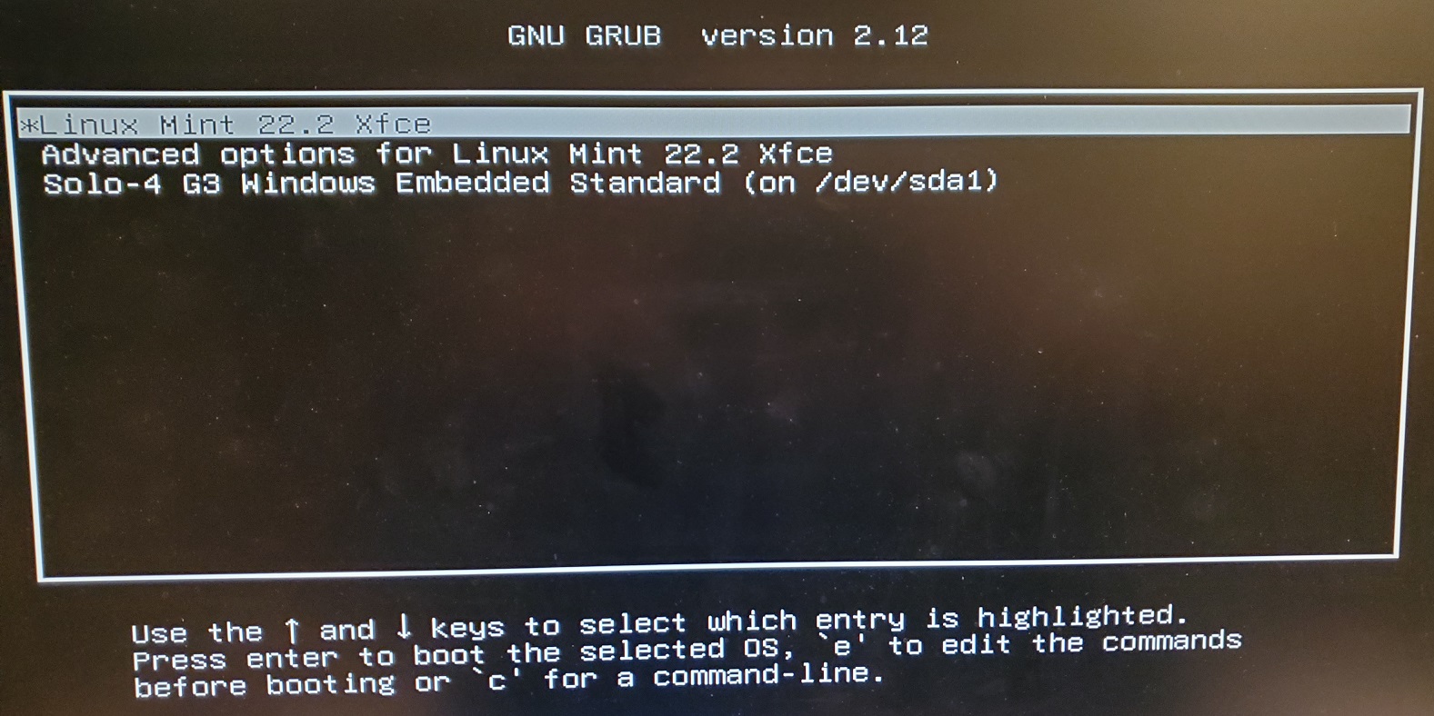 Installing a Linux OSI had tried to install the latest Ubuntu Linux OS (24.04.3 LTS), but with only 2 GB of memory, that became impossible to do! Just the OS by itself requires quite a bit of memory, and each time I tried an install, the unit locked-up about 1/2 to 2/3 of the way through; even when not connected to the Internet. So, I decided to try installing an OS that used less resources: I chose Linux Mint 22.2 Zara Xfce (an LTS release; supported until 2029). Be sure to get the Xfce edition from that page! I did the install offline; booting from a USB drive made with RUFUS and the downloaded .ISO file, along with an attached Keyboard of course, and it completed fine. Here is a pic of my unit running Linux Mint: NOTE: Its quite easy to install a linux driver for the eGalax touch screen on the Solo-4 G3 unit! I downloaded eGTouch_v2.5.13219.L-x.7z from here into the Downloads folder. The setup was fairly simple. I needed to install a 7-Zip app (sudo apt install p7zip-full) in order to extract the 7-zipped files into another folder, navigate to that folder and execute the setup program. Here are all the entries I used to install the eGalax driver from a Terminal screen: